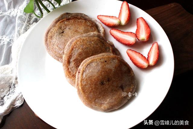 2,平底锅里加入适量的花生油,放入入小饼改成小火慢慢地煎熟后,出锅装盘,边上点缀草莓上桌即成。